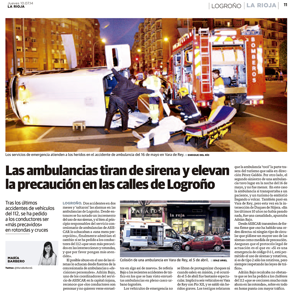 Además de realizar toda la semana la curiosa sección del Teléfono del Lector ( y preparar futuros reportajes que pronto veréis), el jueves 10 se publicaba mi noticia ‘Las ambulancias tiran de sirena y extreman las precauciones en Logroño’: